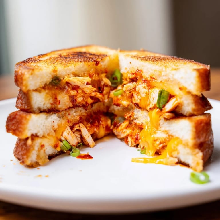 Save My coworker Marcus brought gochujang mayo chicken to lunch one day, and I watched him stack it between two pieces of buttered bread before pressing it flat on a panini pan. The smell of caramelizing cheese mixed with that distinctive Korean chili heat filled the break room, and suddenly everyone wanted a bite. I went home determined to recreate it, and the moment those crispy, golden edges met my teeth alongside the spicy-creamy chicken inside, I understood why he'd been so secretive about the recipe.