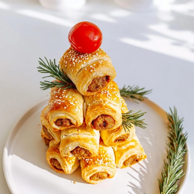 Save A festive, crowd-pleasing appetizer featuring golden, flaky mini sausage rolls arranged in the shape of a Christmas tree—perfect for holiday gatherings.