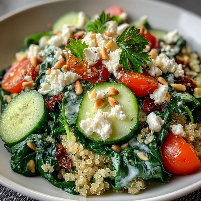 Save There's something about assembling a grain bowl that feels like you're creating edible art on a Tuesday afternoon. I stumbled onto this spinach and feta combination while standing in my kitchen, staring at a bag of wilting spinach and wondering if I could salvage it into something worth eating. What emerged was this brilliant, colorful bowl that tasted nothing like a desperate attempt to use up vegetables—it tasted like I'd planned it all along, with warm grains cradling tender greens and bright bursts of tomato and cucumber catching the light.