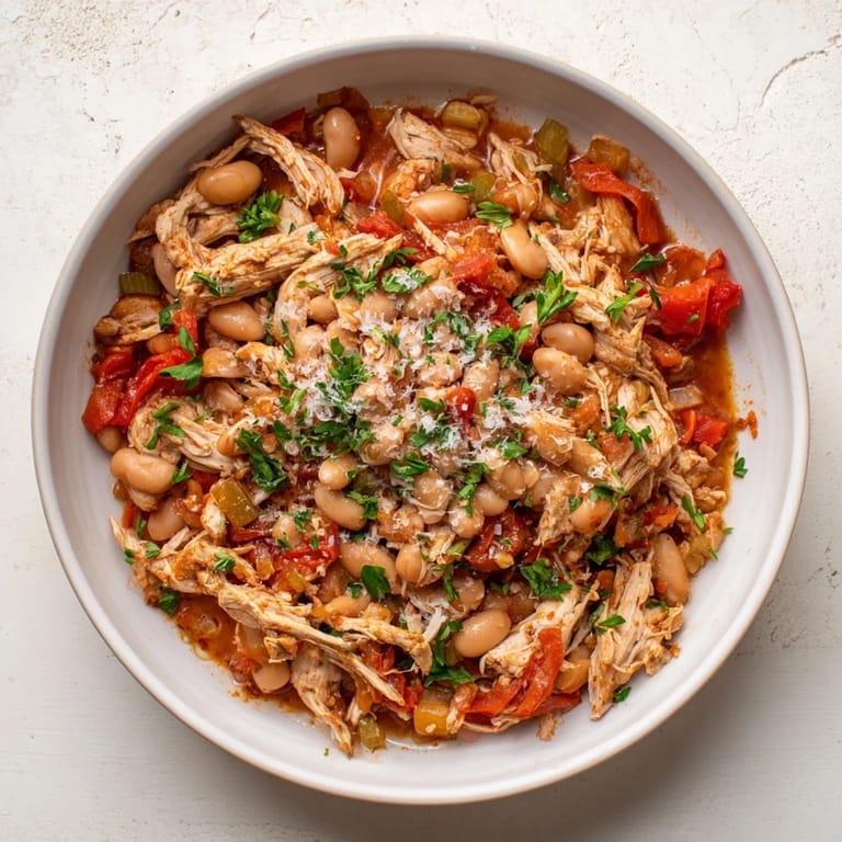 Save I pulled this recipe together on a gray Wednesday when the fridge looked bare but the pantry was surprisingly well stocked. A jar of roasted red peppers I'd forgotten about, two cans of navy beans, and leftover rotisserie chicken became something I now make on purpose. The smell of smoked paprika hitting warm olive oil still reminds me of that first bowl I ate standing at the counter, surprised at how something so simple could feel so complete.